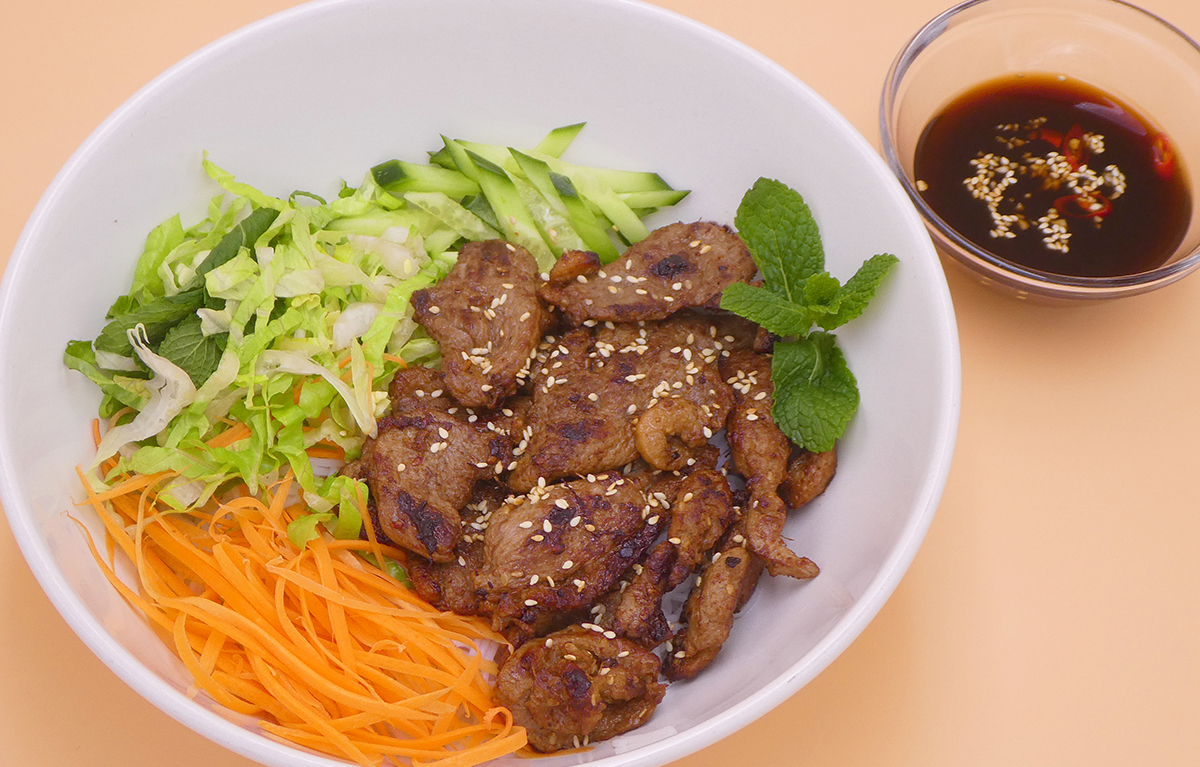 rýžové nudle, hovězí maso, mrkev, okurky, listový salát, výhonky mungo, smažená cibulka, pražené arašídy, rybí omáčka, omáčka Cay Cay. (5) BL, můžeme upravit i jako VEG (tofu)