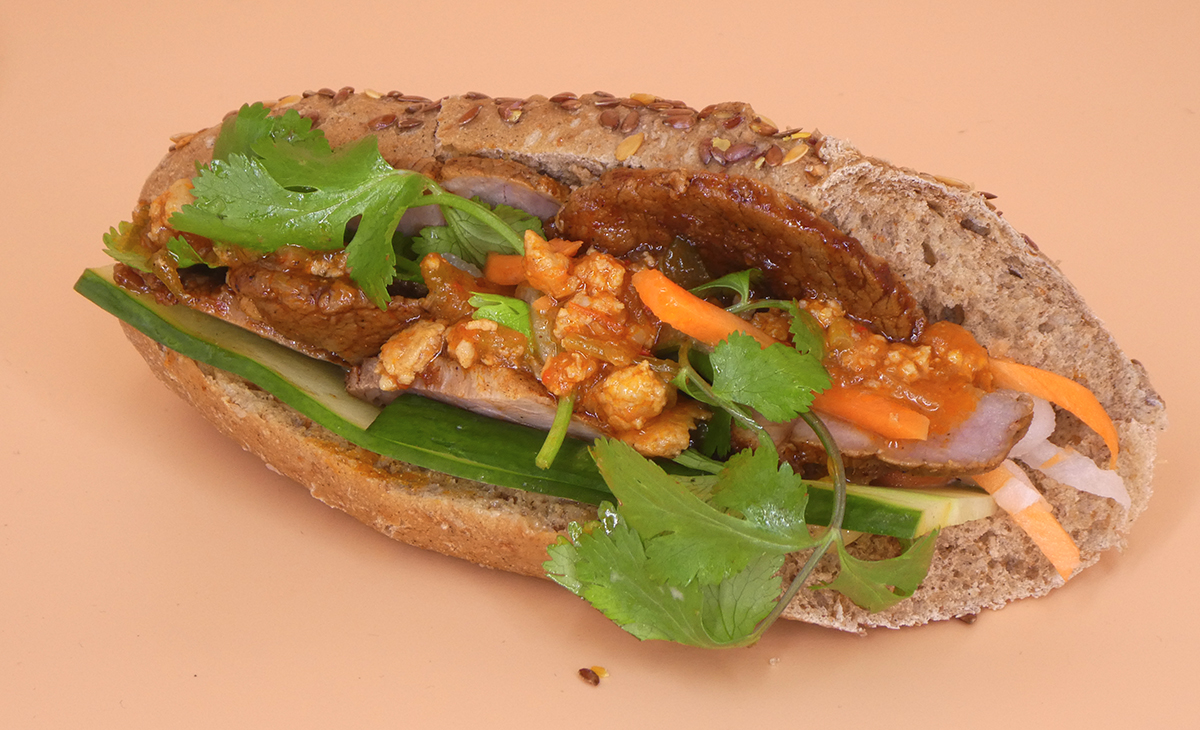 teplá vietnamská bageta, paštika, nakládané vepřové maso, sekaná, okurka, bílá ředkev, mrkev, koriandr, domácí zálivka a jemná majonéza. Pálivá/nepálivá.