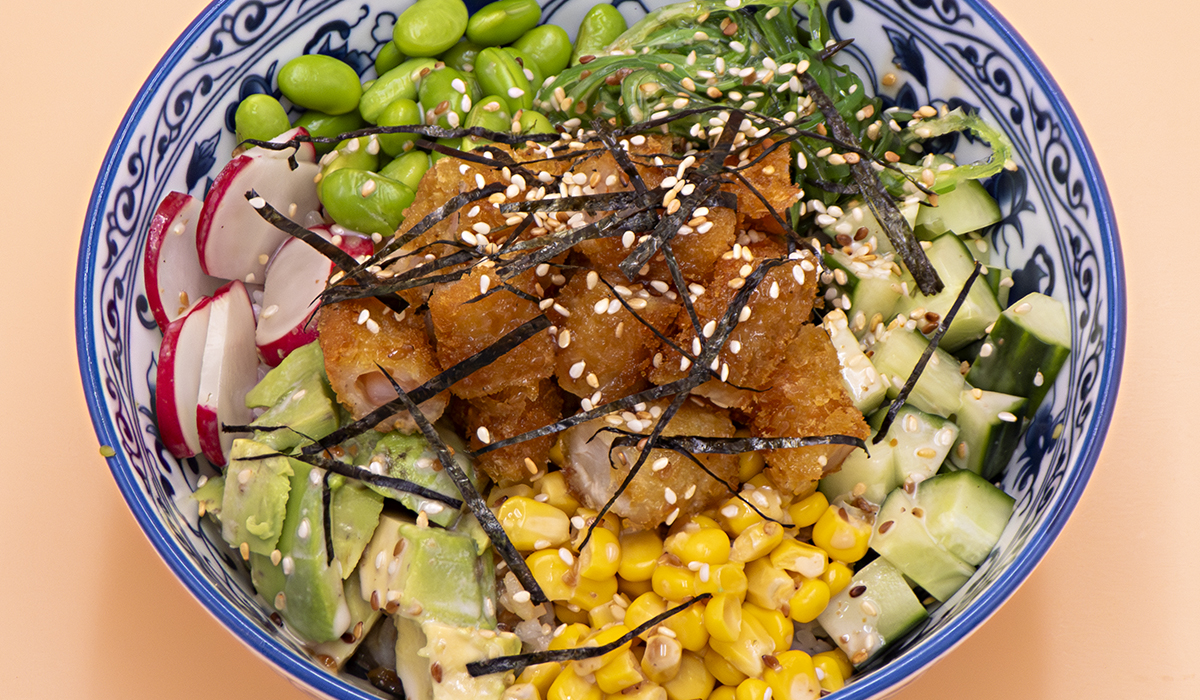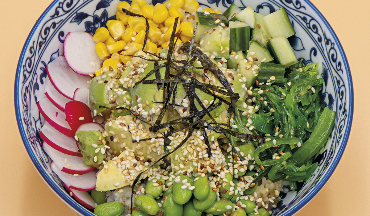 duhová miska – edamame (nezralé sójové boby), kukuřice, mořská řasa, ředkvičky, omáčka, sezam a japonská rýže. (2, 4, 6, 11)