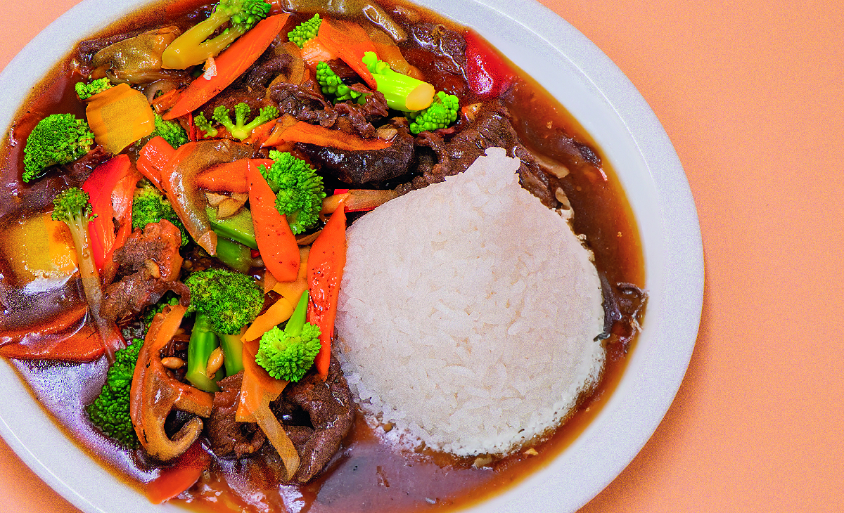 marinované hovězí maso, brokolice, zelenina a jasmínová rýže. (4, 9) BL, možná úprava jako VEG (tofu)