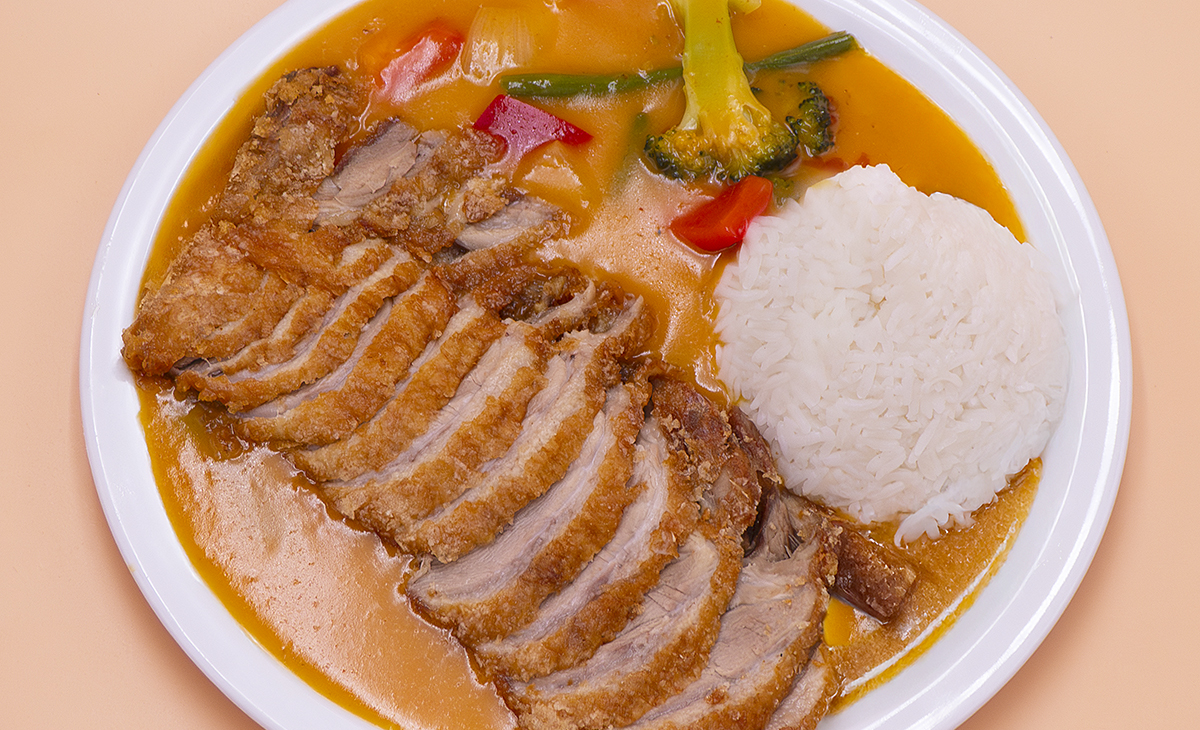 červené kari, křupavá kachna, zelenina, kokosové mléko a smetana a jasmínová rýže. (1, 7) možná úprava s TOFU.1
