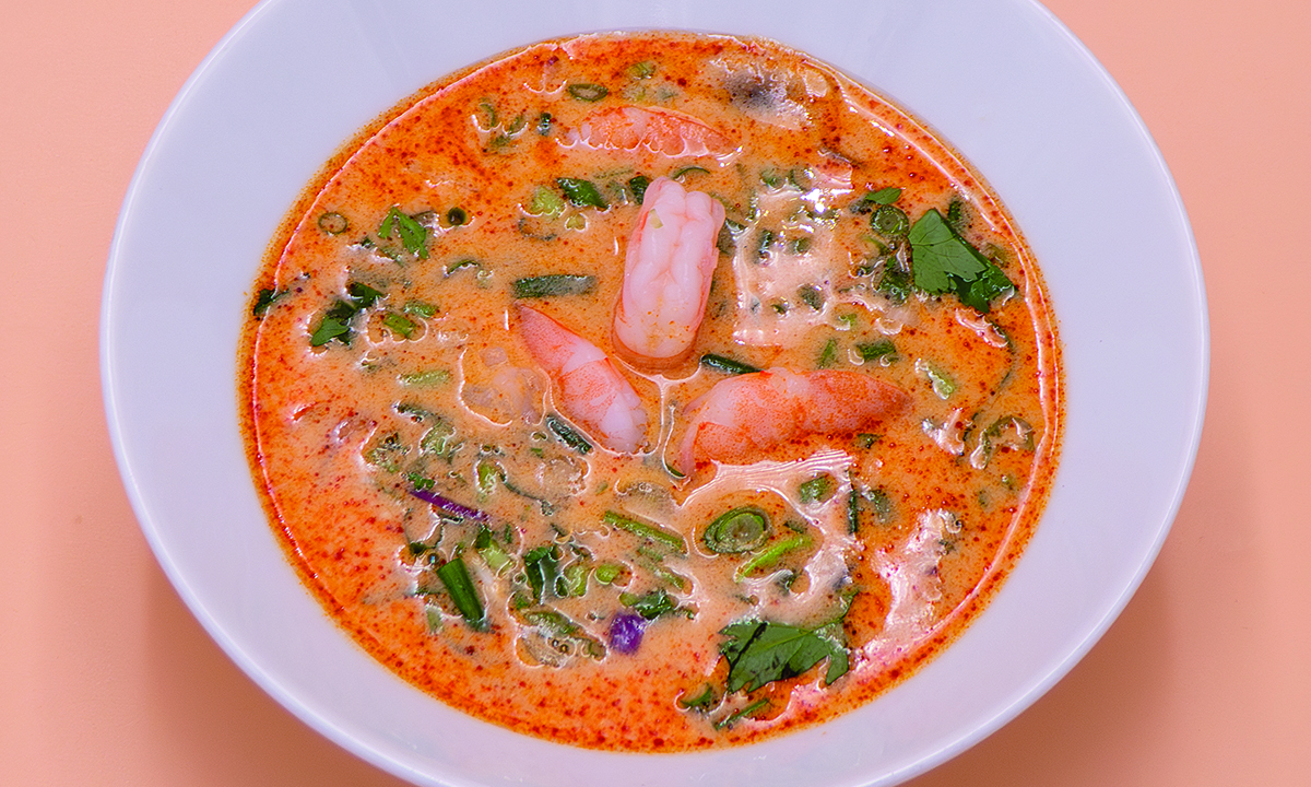 malá lehká polévka, kokosové mléko, smetana, krevety, zelenina (2, 7). BL